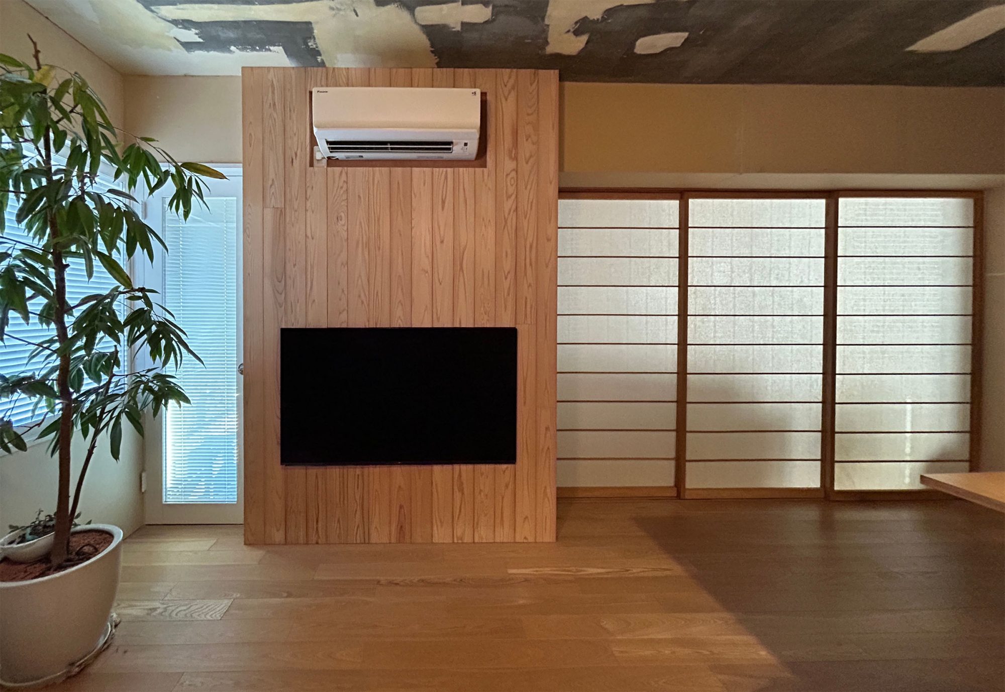 うちでもあれこれ模索してエアコンを後付けしました。自分の家のことは自分で調べるをモットーに、電源ルートを探し、あちこち壁を剥がして、下地を入れるところまでは自分でやり、後は設備屋さんにお願いをしました。