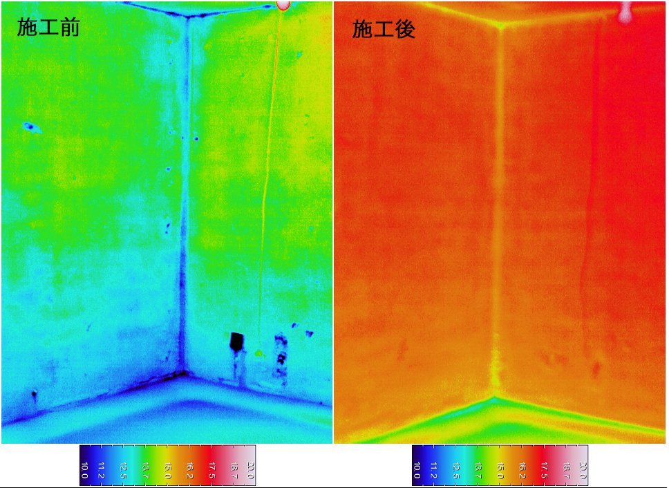 施工前後で温度域を合わせた写真ですが、結果は歴然。施工後は壁から離れていても変化がわかるほどでした。